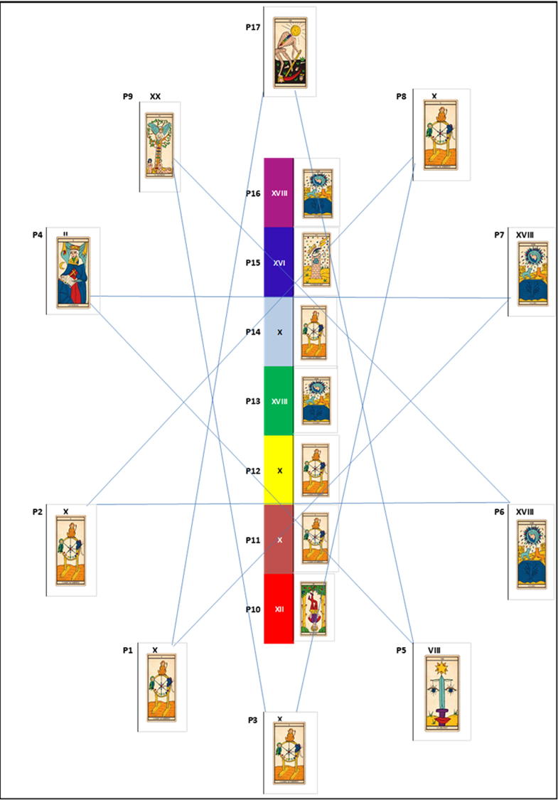 Des limbes, Poste 3, elle a voulu initier un nouveau départ et stopper le cycle des répétitions, la Roue de Fortune occupe le Poste 11 et le Pendu le Poste 10, habituel Champ Magnétique entre les Postes 10 et 11. Dans son cas, il s’agit vraiment d’initier un nouveau départ karmique ET transgénérationnel, faire tourner la roue du renouveau et couper le cordon qui maintient prisonnier des mémoires transgénérationnelles.
